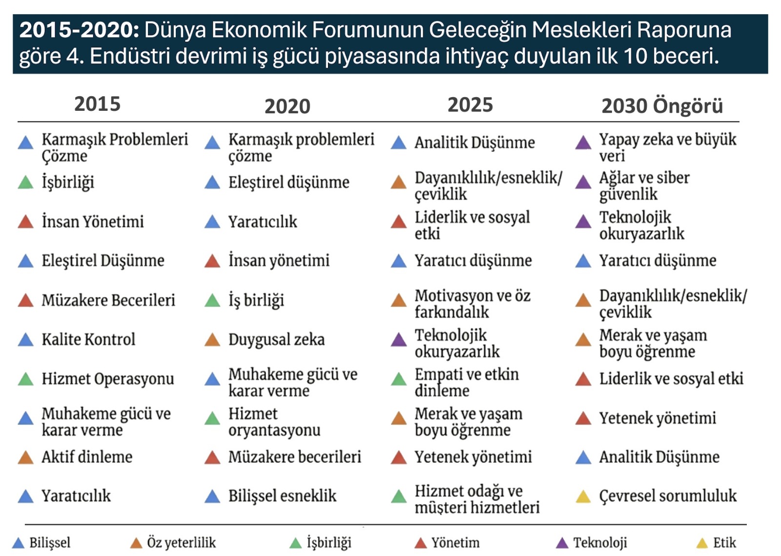 Geleceğin Meslekleri Raporu kapsamında yayımlanan “ilk 10 beceri” listesi ise işveren beklentileri, teknoloji eğilimleri ve zaman içindeki tutarlılığın kesişiminde şekillenmektedir. Bu liste, bilgi birikiminden ziyade insanî yetkinlikleri merkeze alması bakımından dikkat çekicidir. İlk olarak 2015 yılında Dünya Ekonomik Forumu’nun Davos toplantıları kapsamında paylaşılan ilk 10 beceri seti, 2025 yılına kadar düzenli aralıklarla güncellenmiş; her dönemde değişen dünya koşullarına paralel olarak farklı beceri profilleri öne çıkmıştır. Bu durum, geleceğin becerilerinin sabit bir liste değil, sürekli evrilen bir yetkinlik alanı olduğunu açıkça göstermektedir.